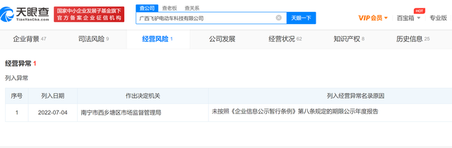 此外,九派新闻注意到,广西飞驴电动车公司因未提交年报,于今年7月被列为经营异常。