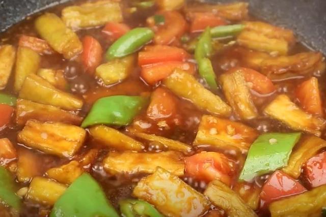 茄子、生抽、老抽、素蚝油、盐、白糖、玉米淀粉、凉白开、食用油、大蒜、姜、葱花、西红柿、青椒